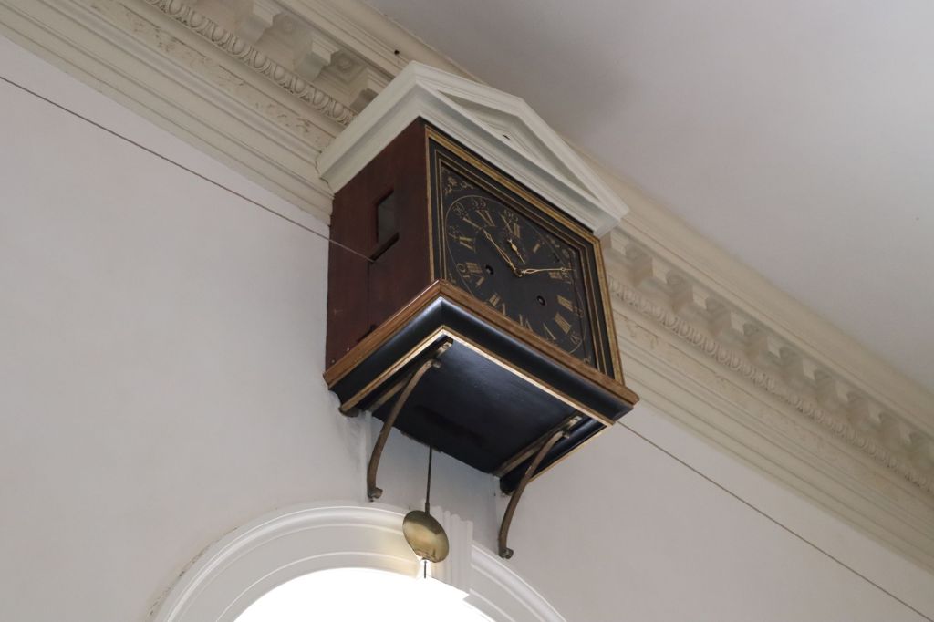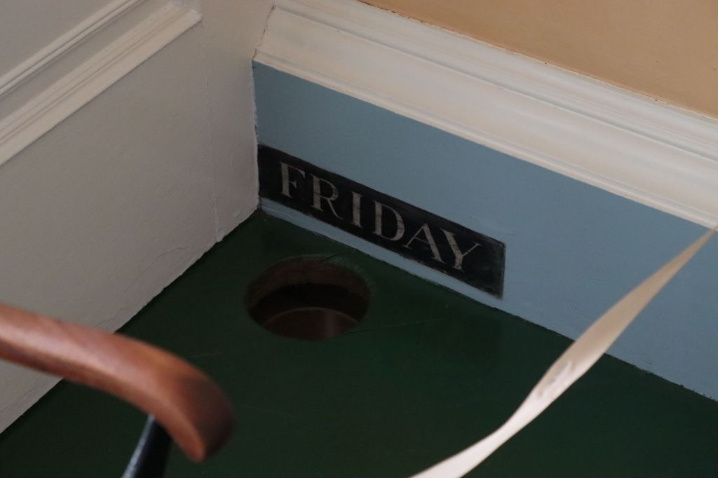 The clock in the Monticello entrance hall, which tells the time and day of the week, was designed before the room. It was found that the cannonballs that tell the day would descend too far, so a hole was cut in the floor. The sign for Saturday can still be seen in the basement.