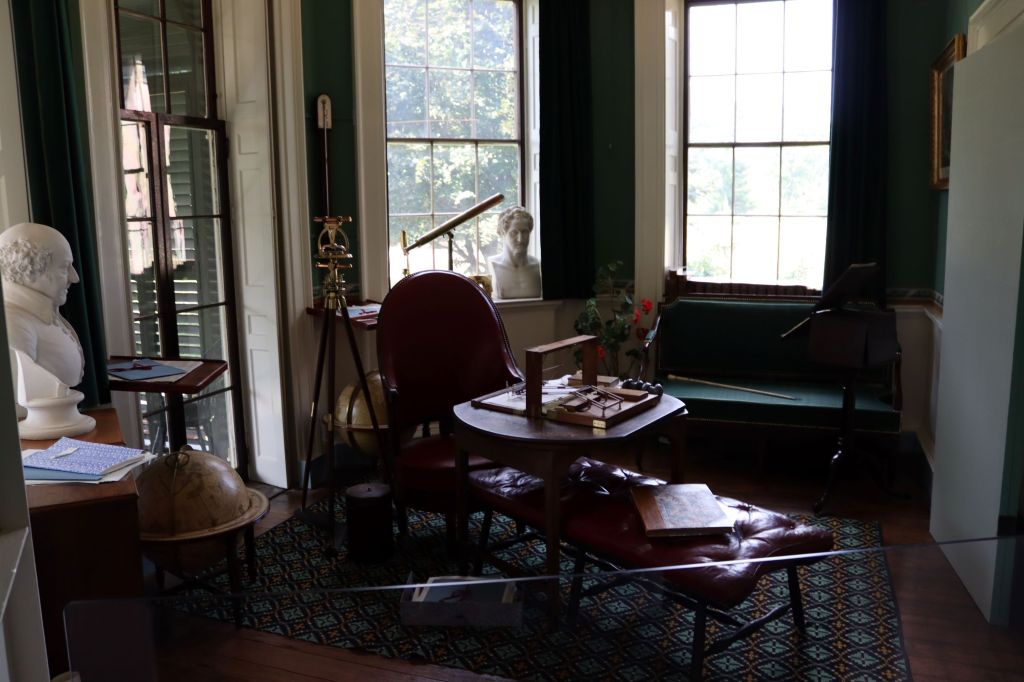 The parlor at Monticello is where Jefferson liked to entertain. It is filled with curiosities, including a trick door, a vacuum chamber device, and portraits of figures Jefferson admired. The room is underneath the dome, and looks out onto the lawn of the home.