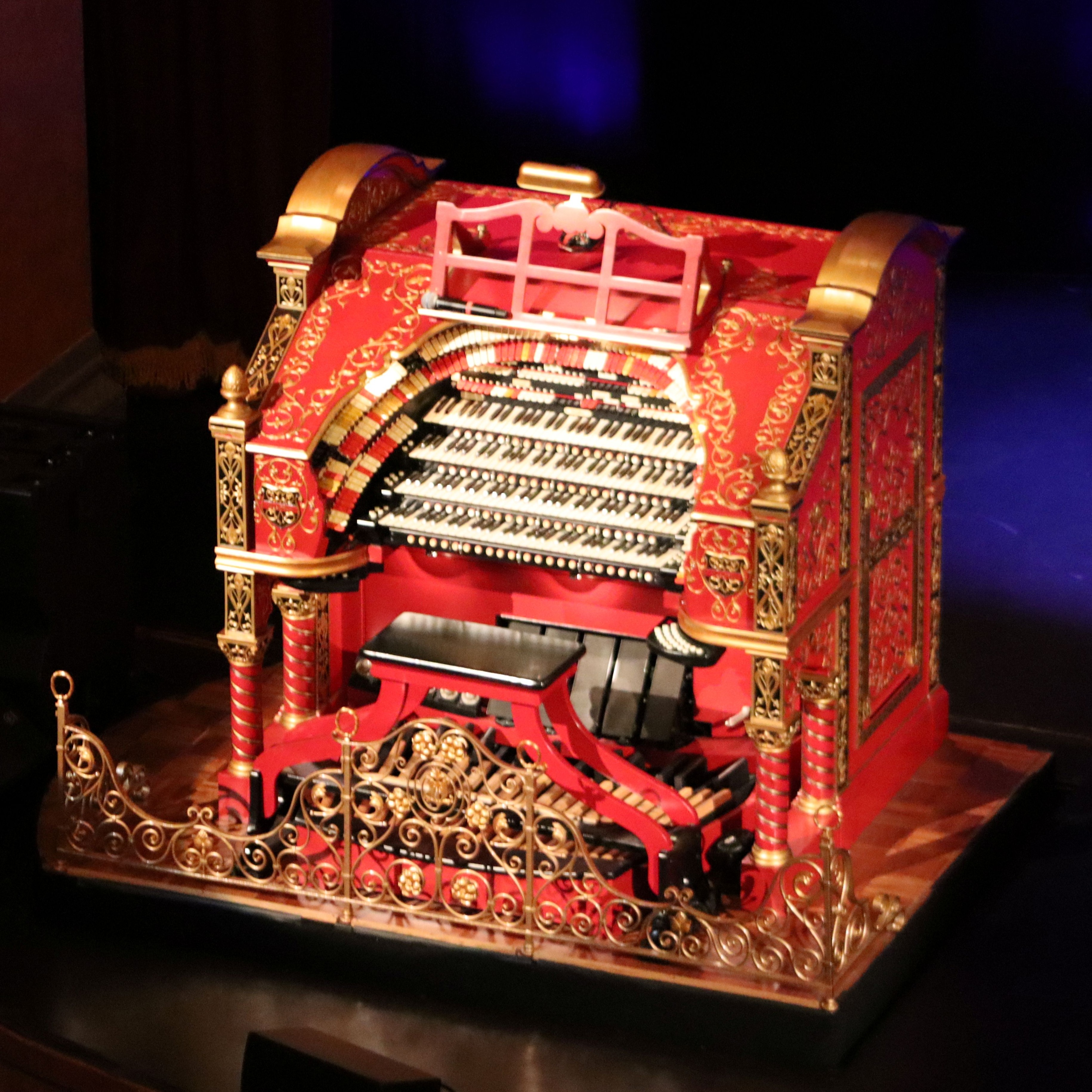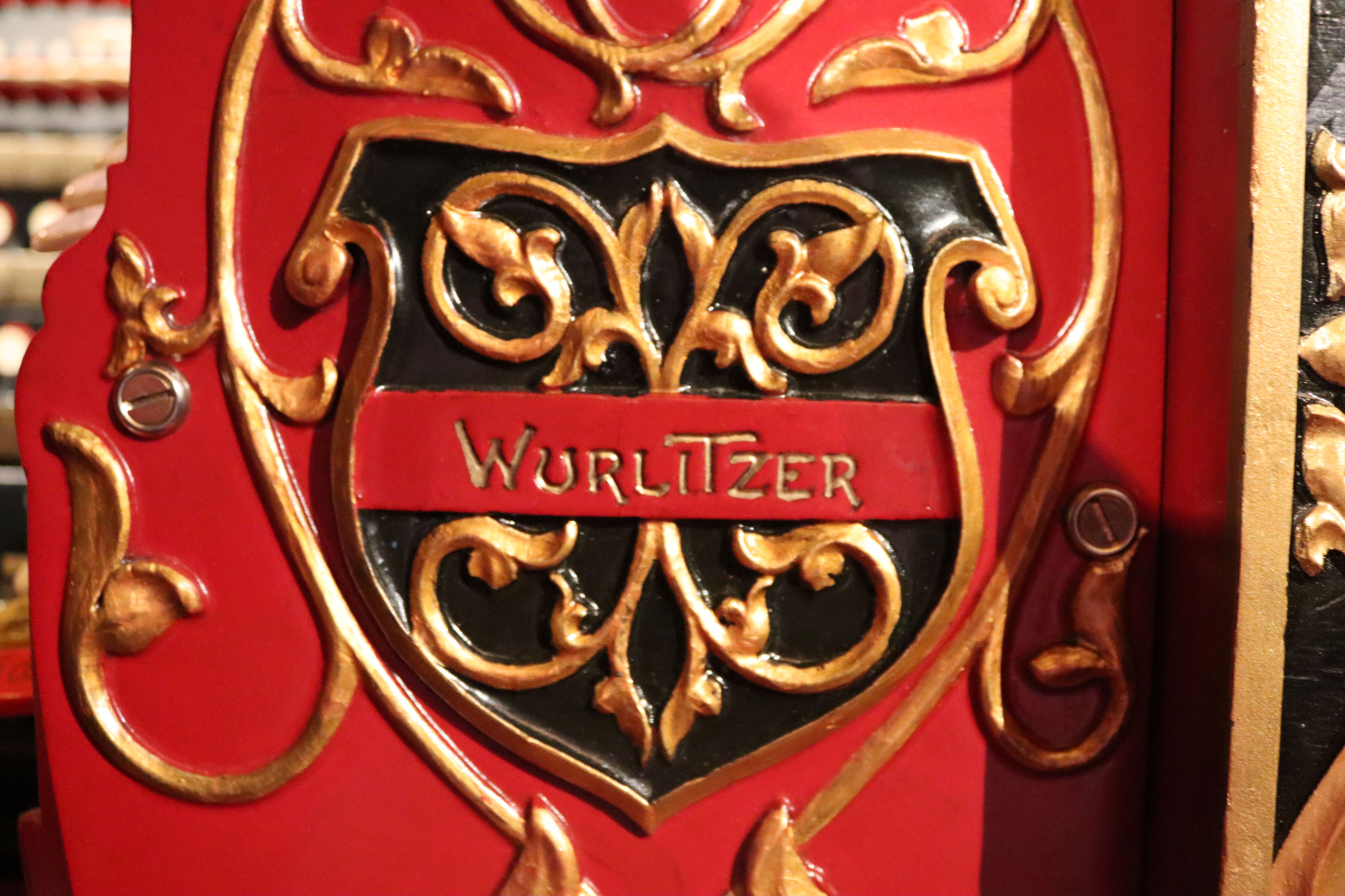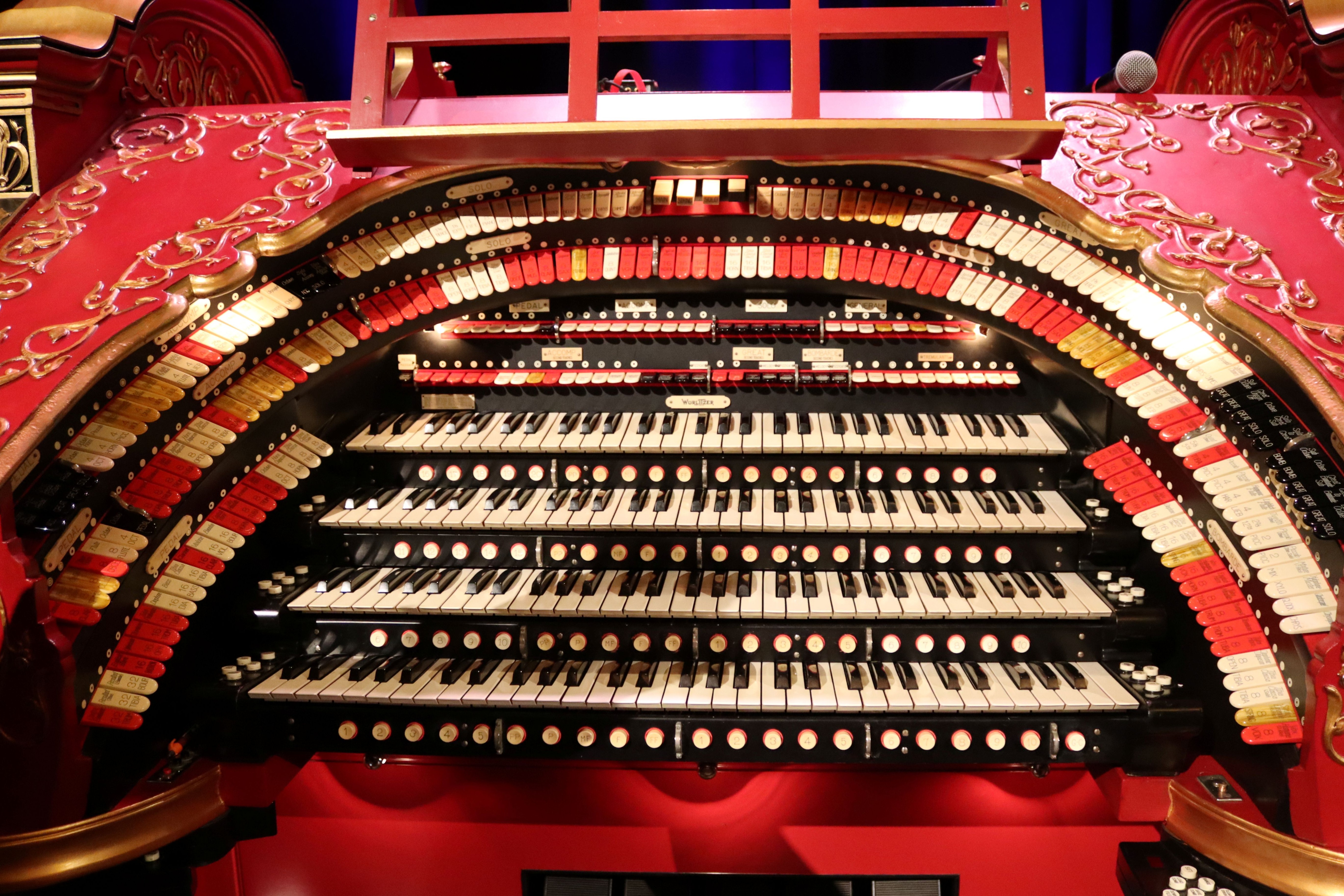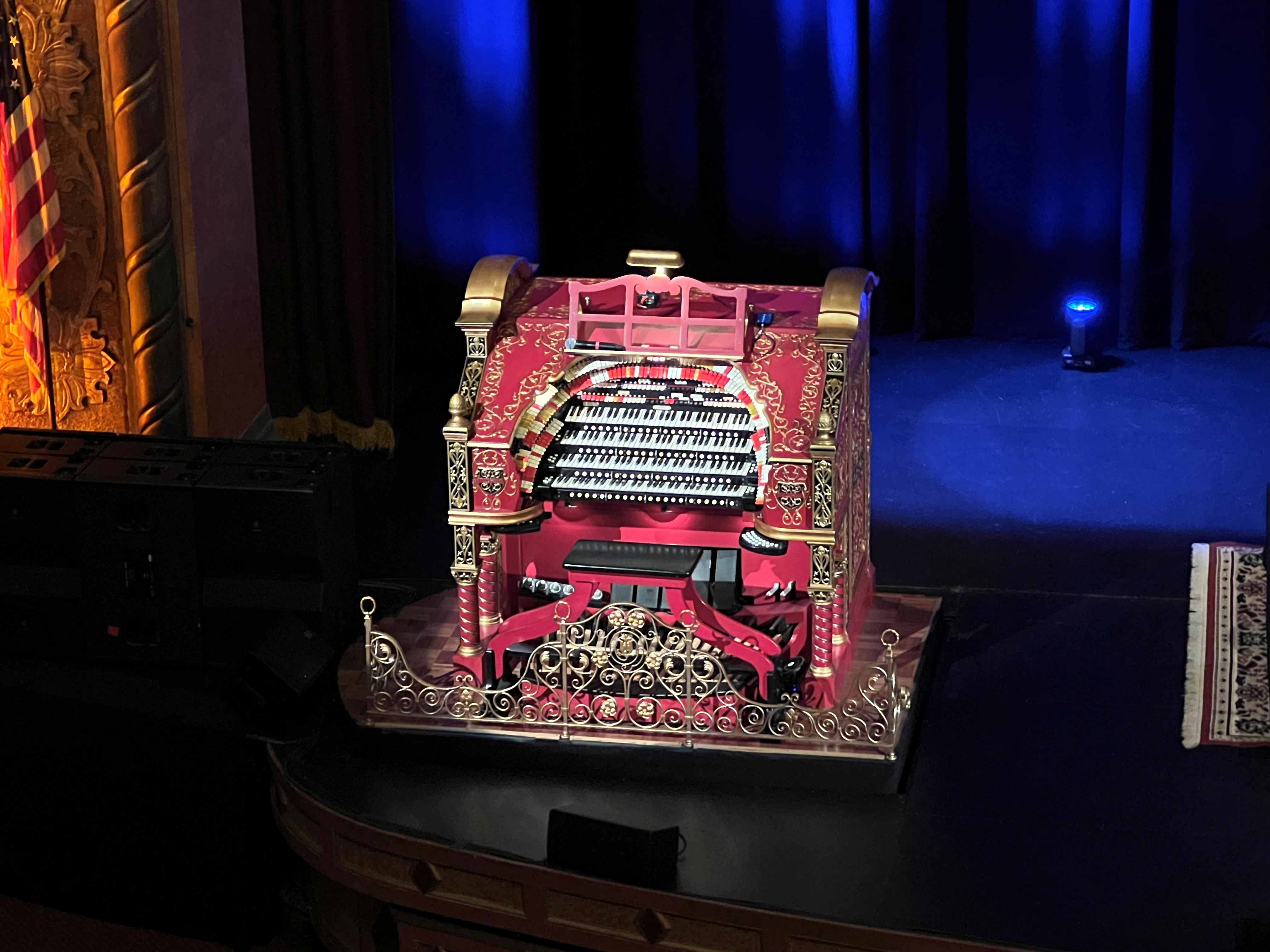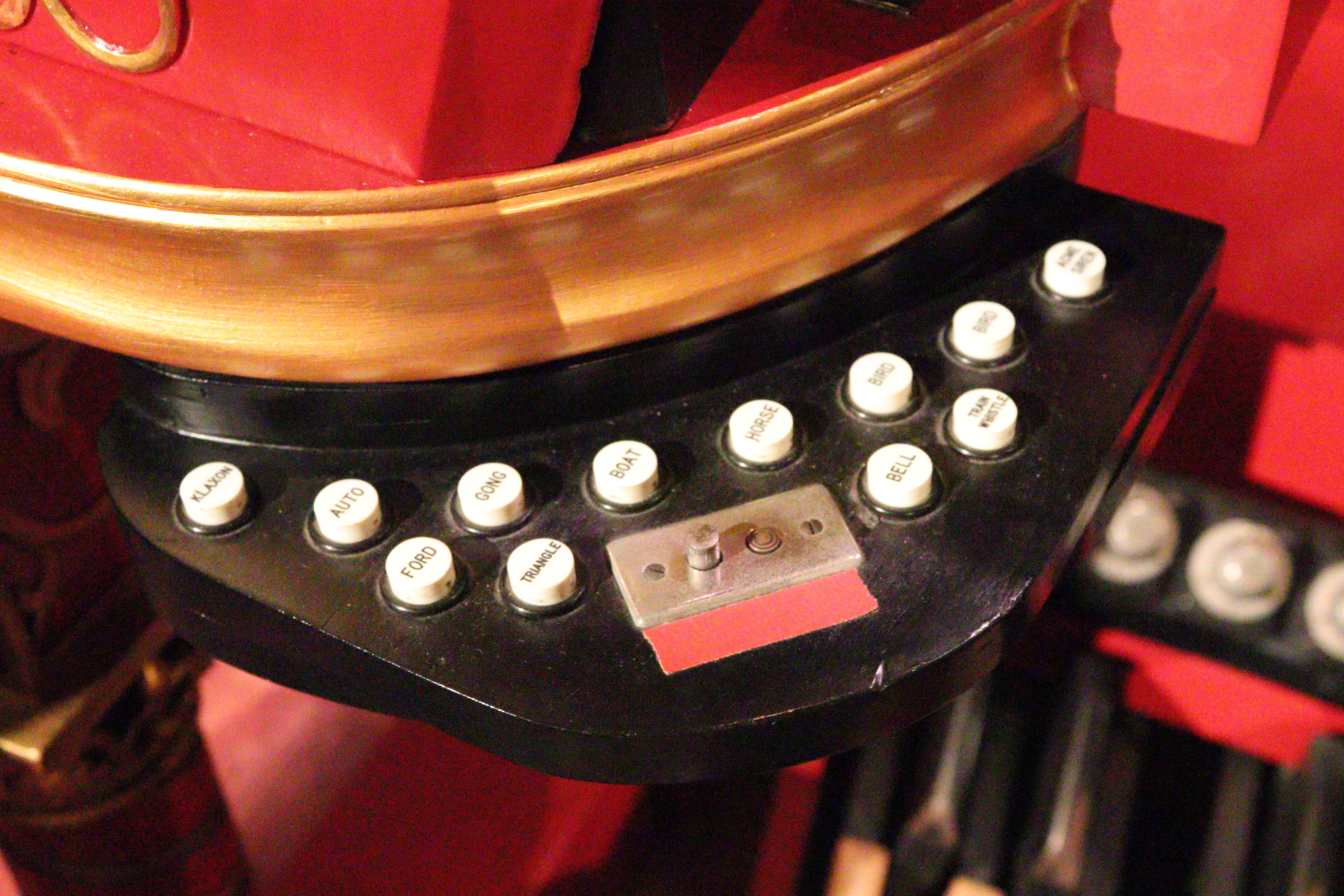 The red organ console shown here is a Wurlitzer known as “Bertha” that has been at the theatre since it opened. It is a one-of-a-kind piece, as Wurlitzer never built another organ identical to it. The penultimate picture is the collection of buttons called the “junk drawer” that allows for more unique sounds that work well for silent films.