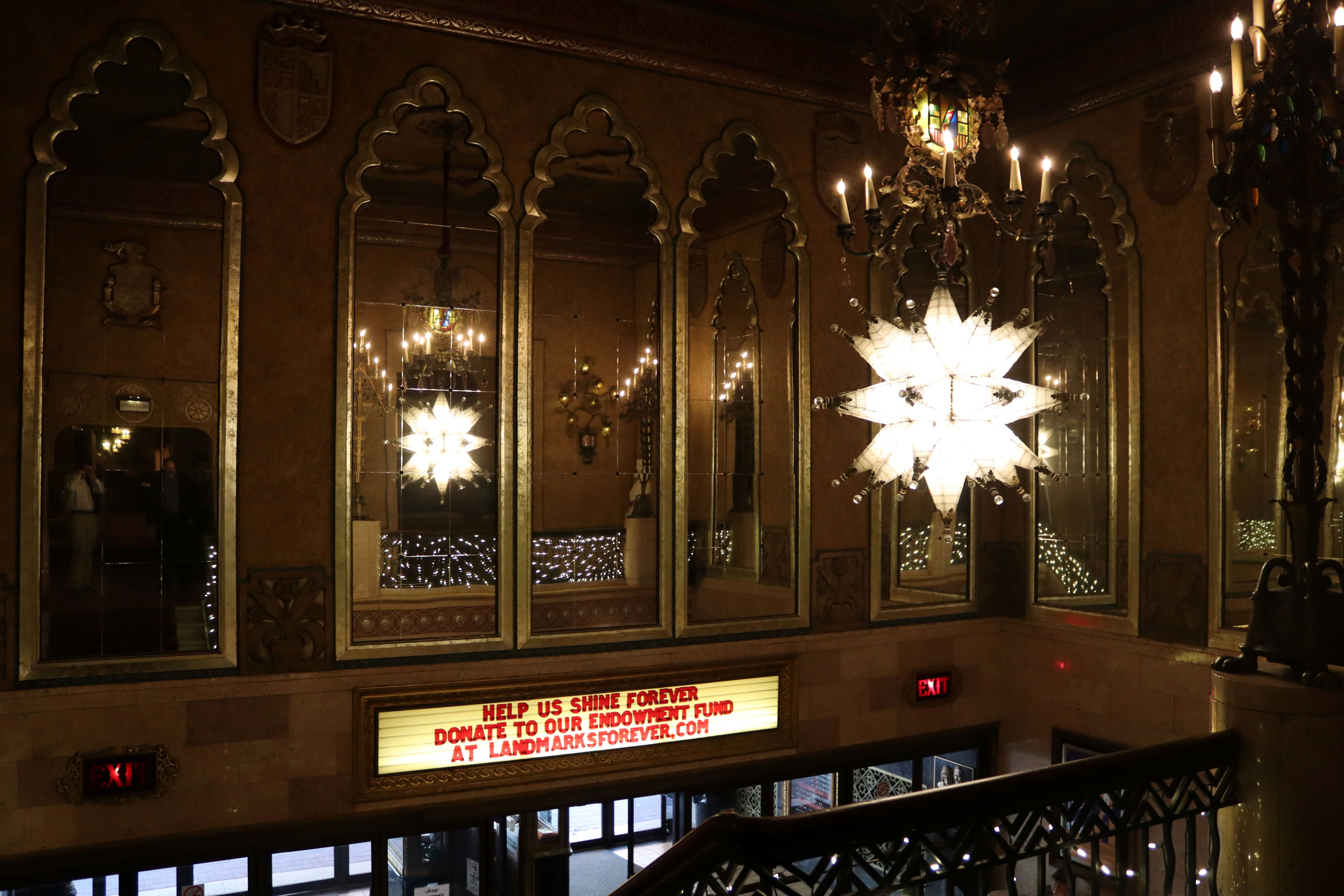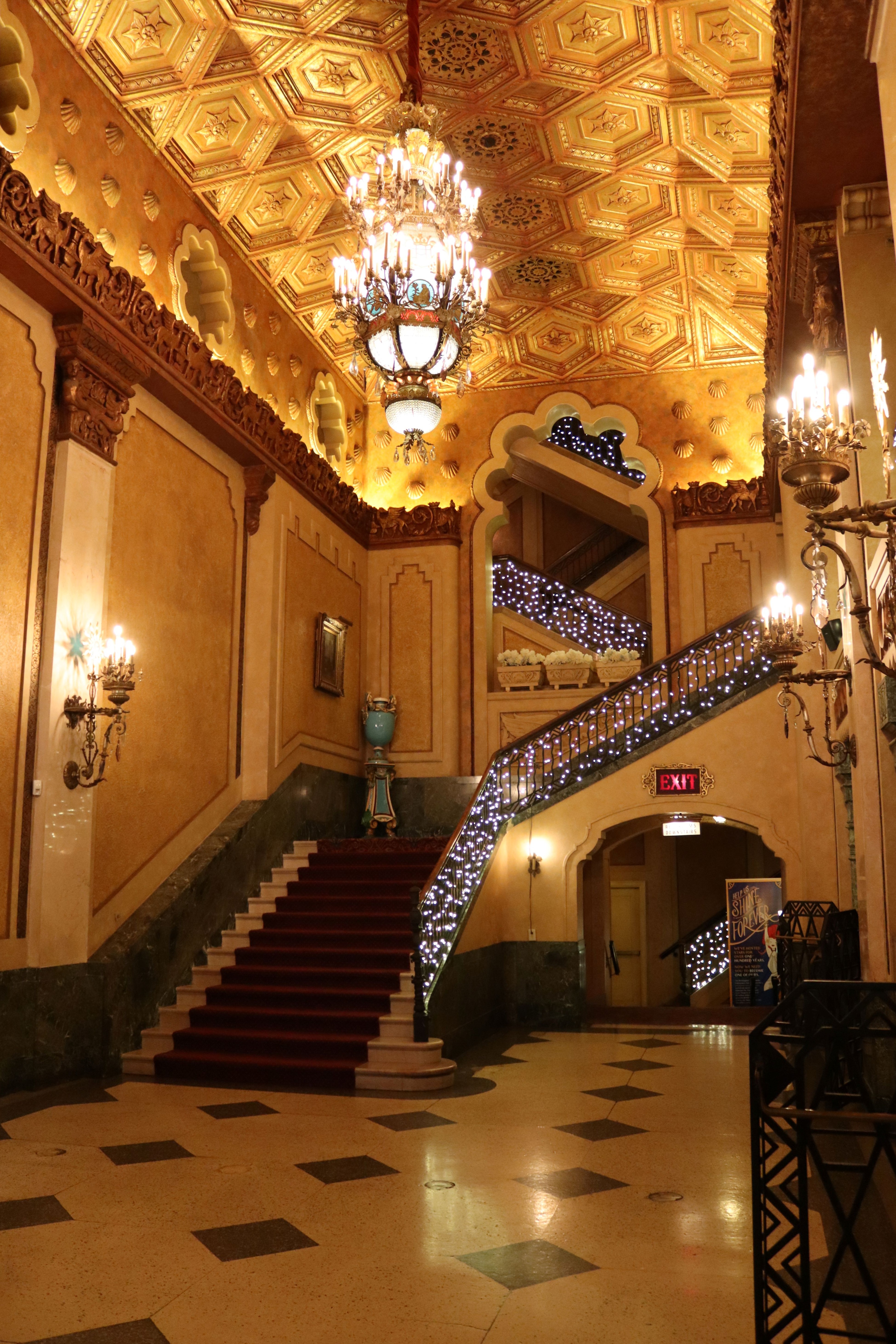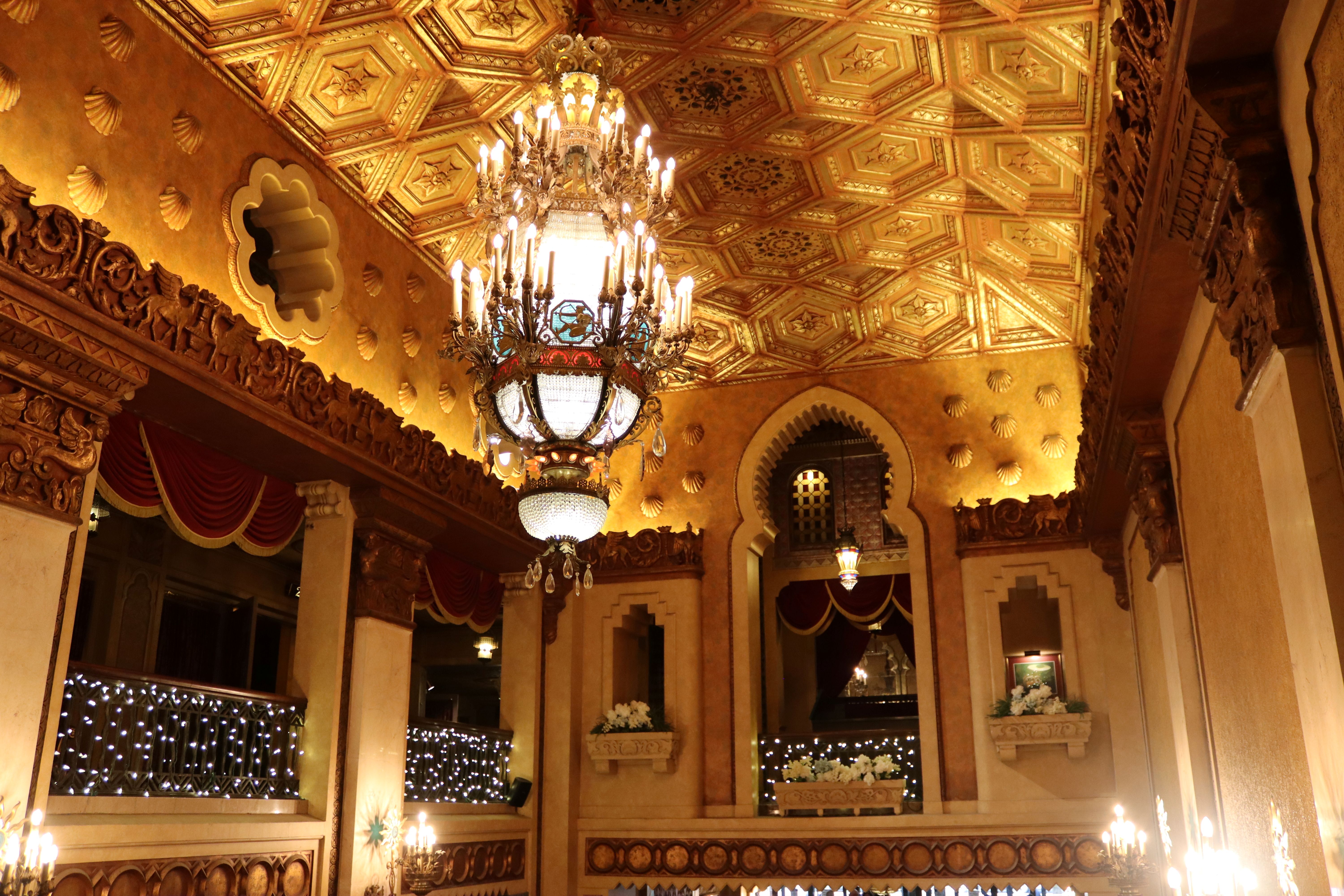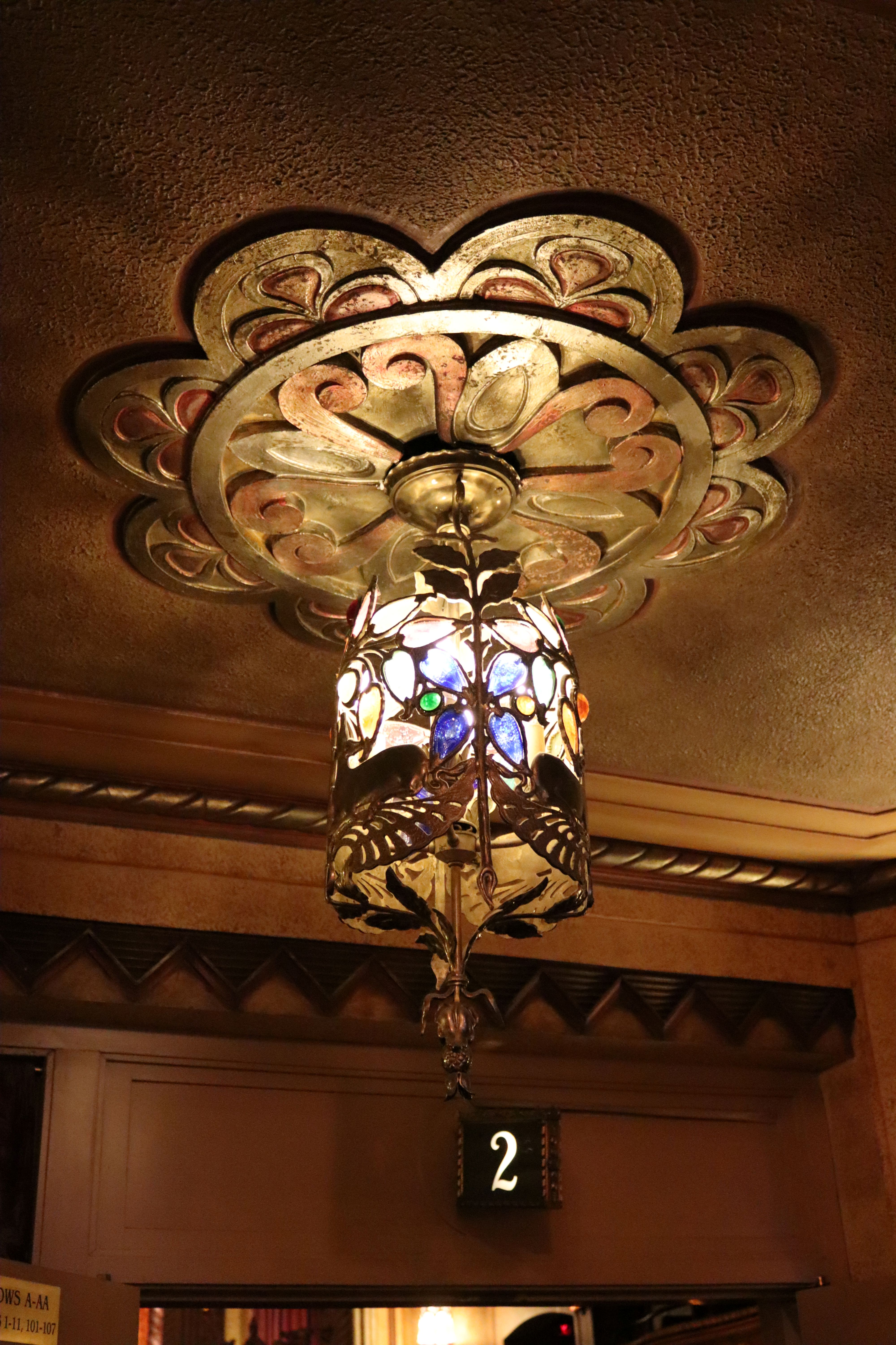 The lobby of the theatre has two large two-story spaces, with a one-story space in between. The first space you walk into is the “Hall of Mirrors.” Beyond that is a larger space in a Spanish Revival style.