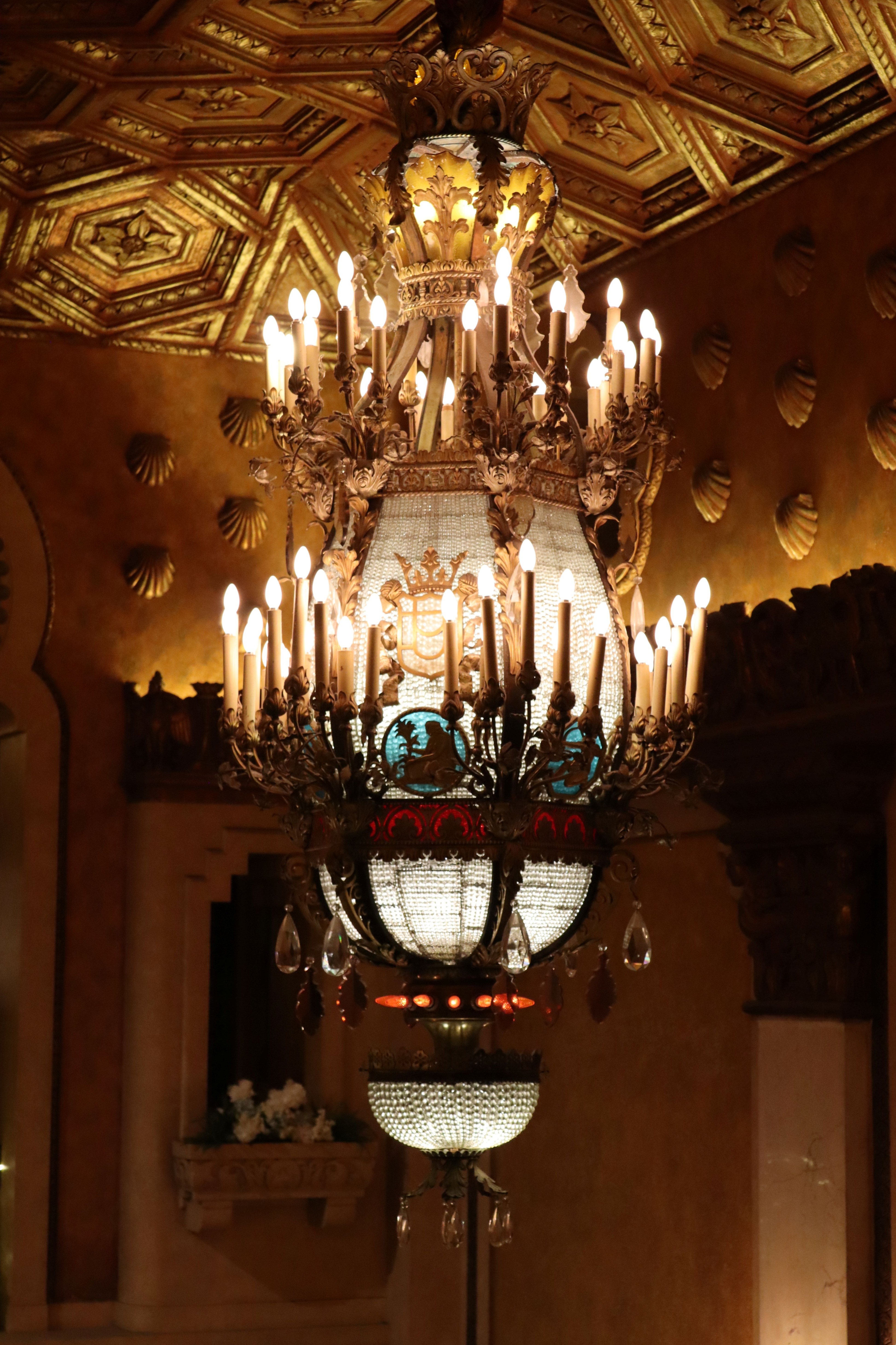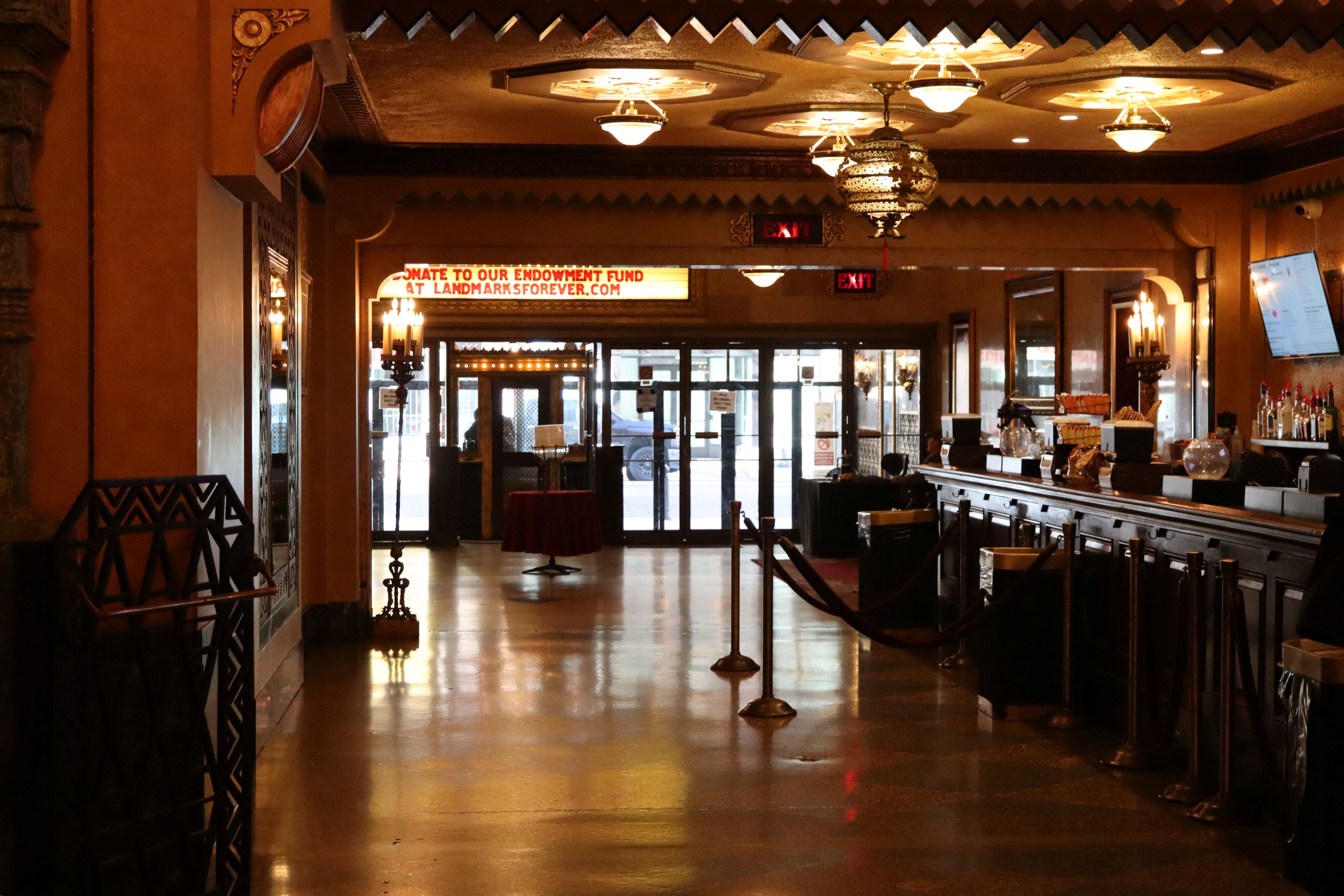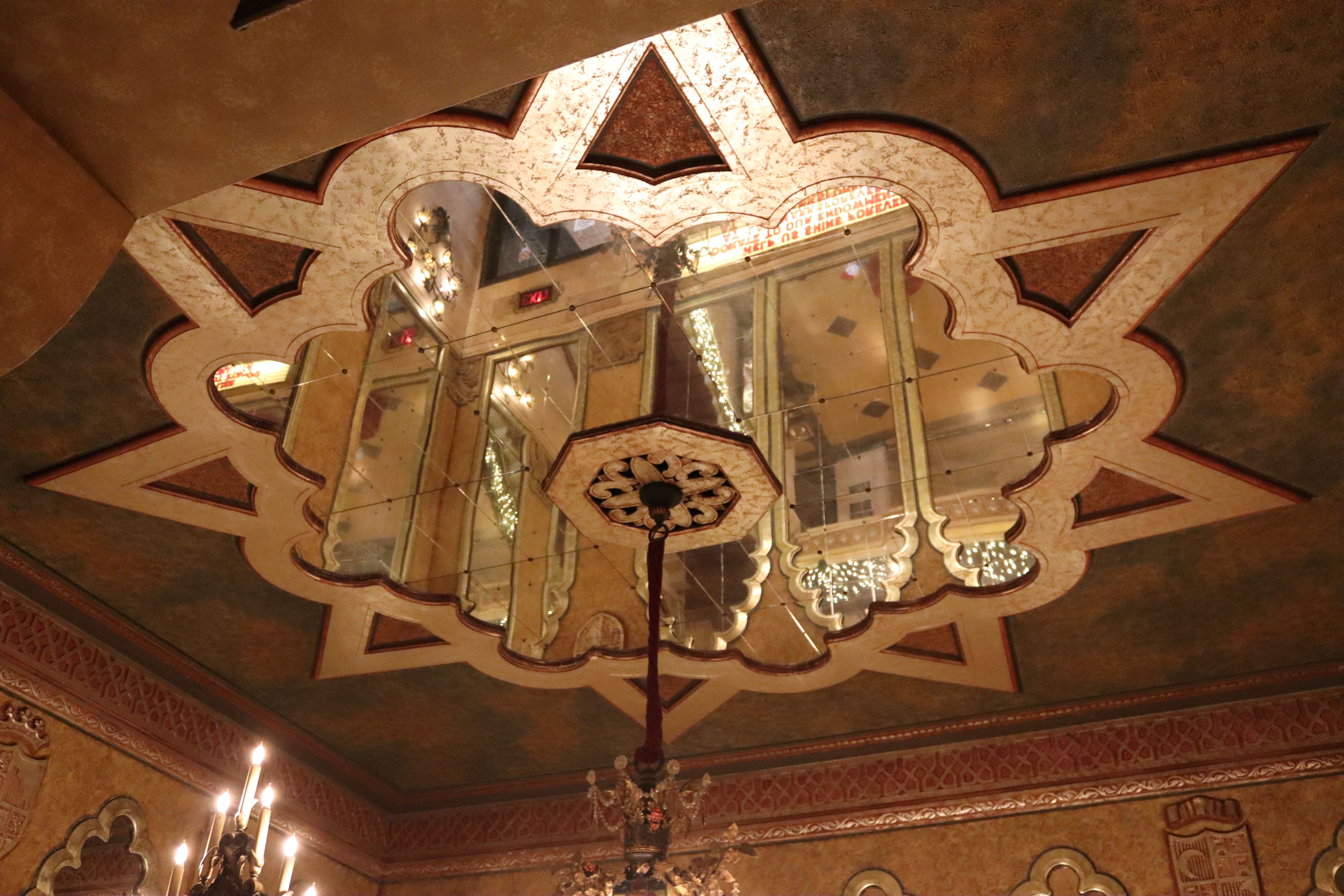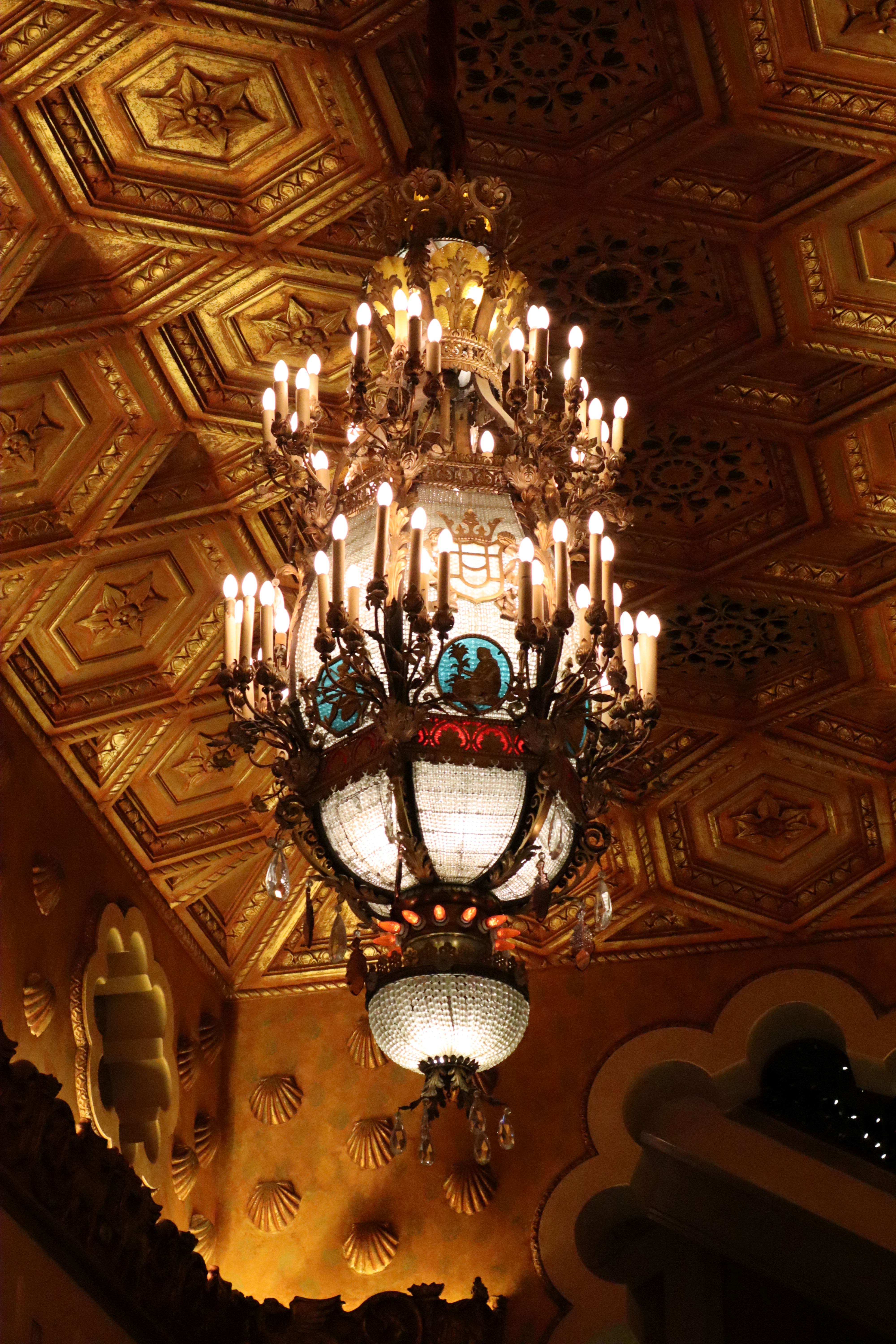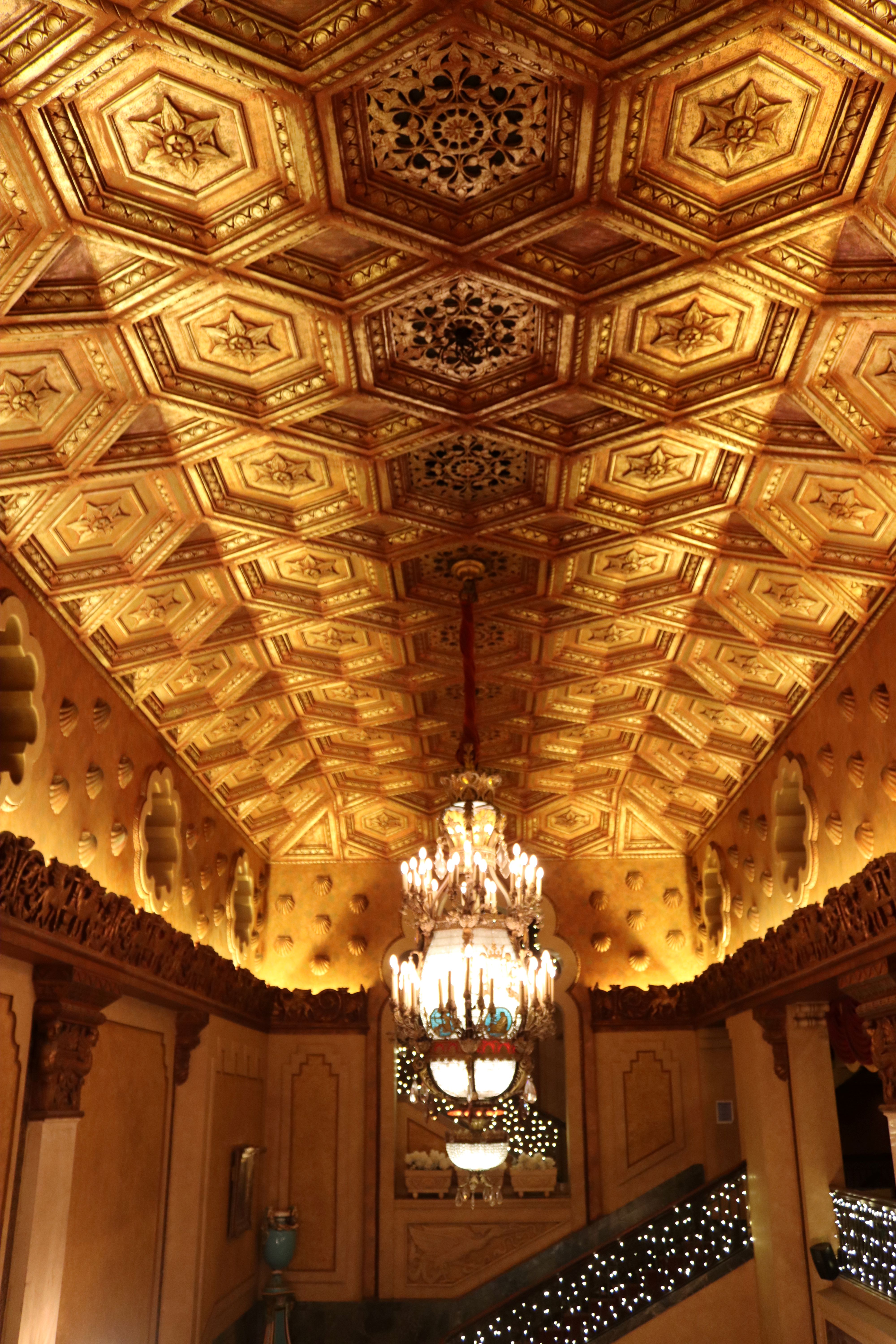 The lobby of the theatre has two large two-story spaces, with a one-story space in between. The first space you walk into is the “Hall of Mirrors.” Beyond that is a larger space in a Spanish Revival style.