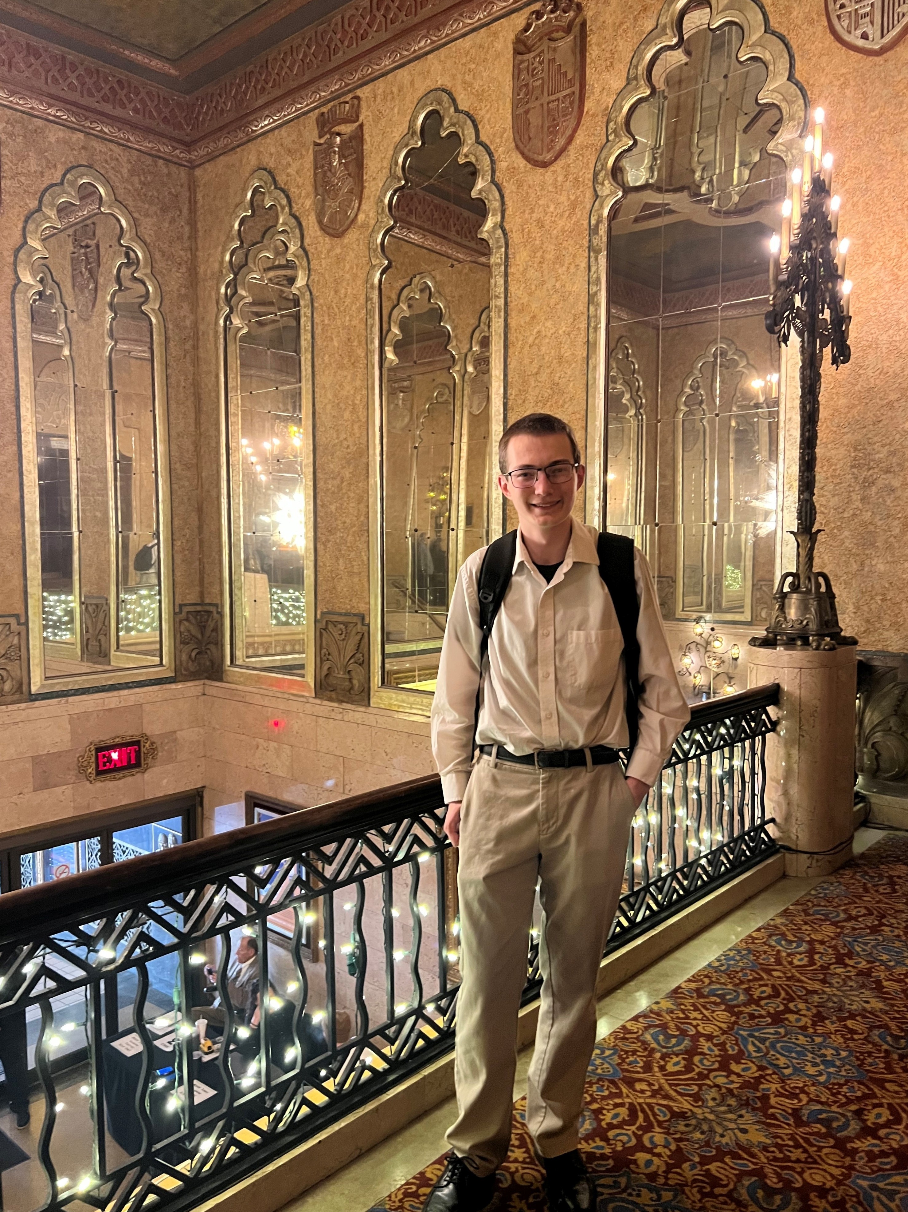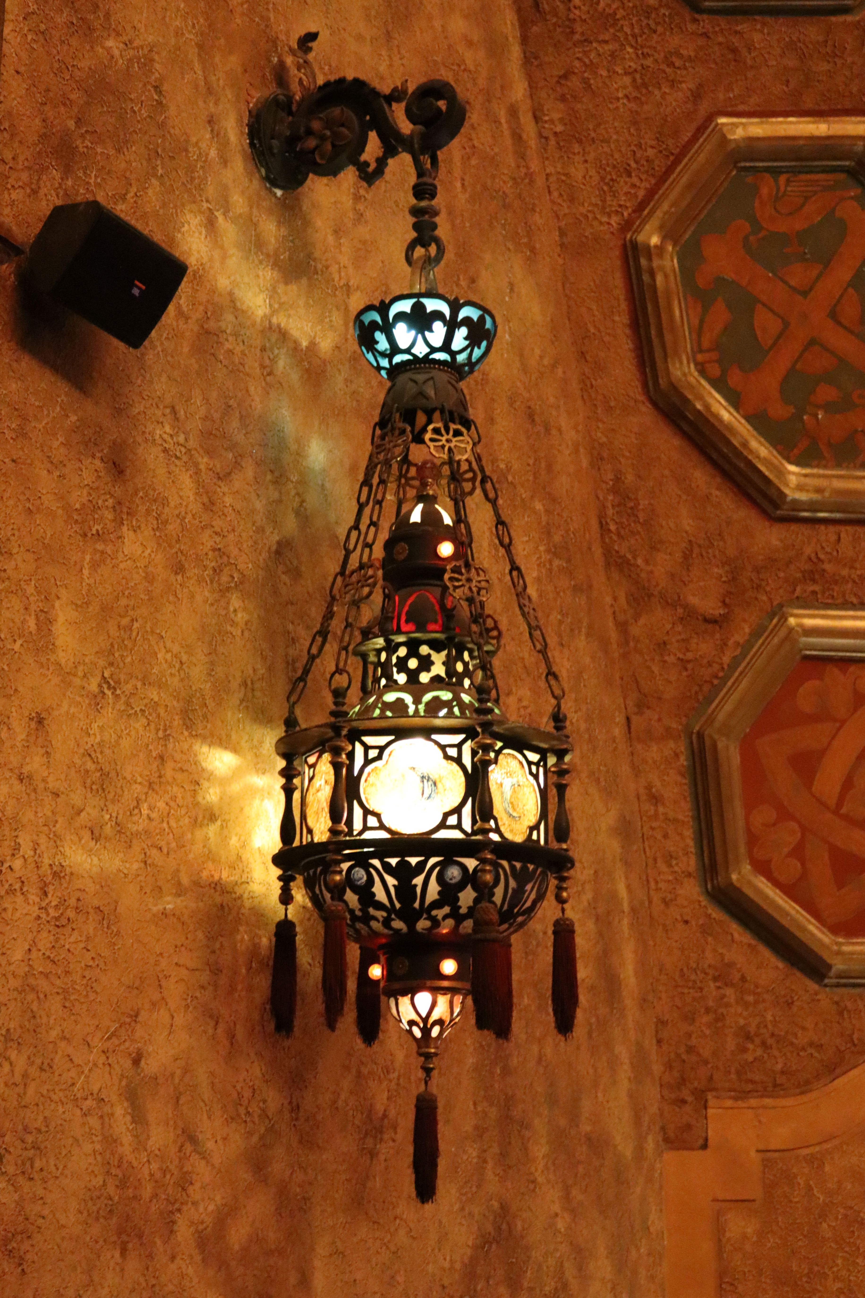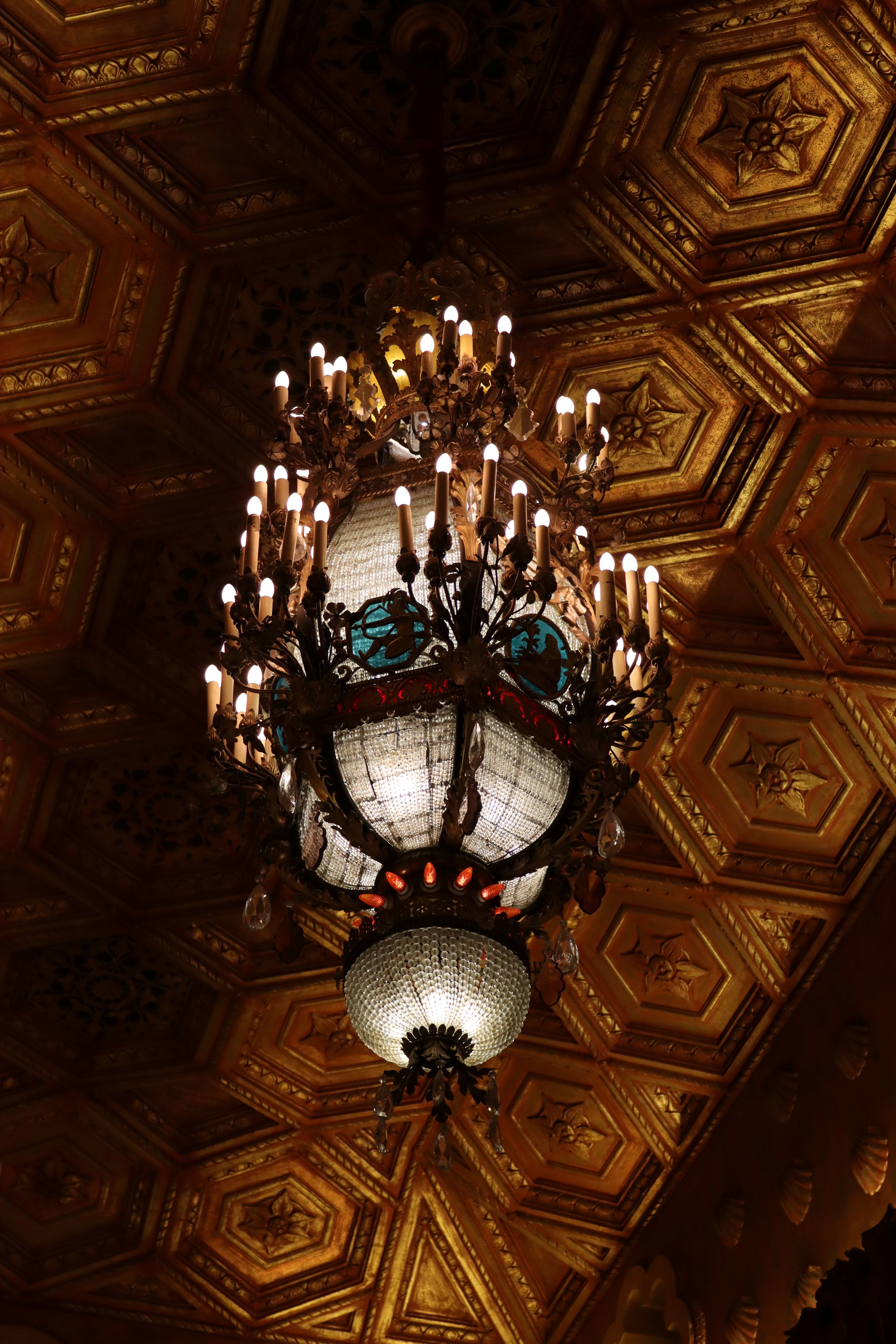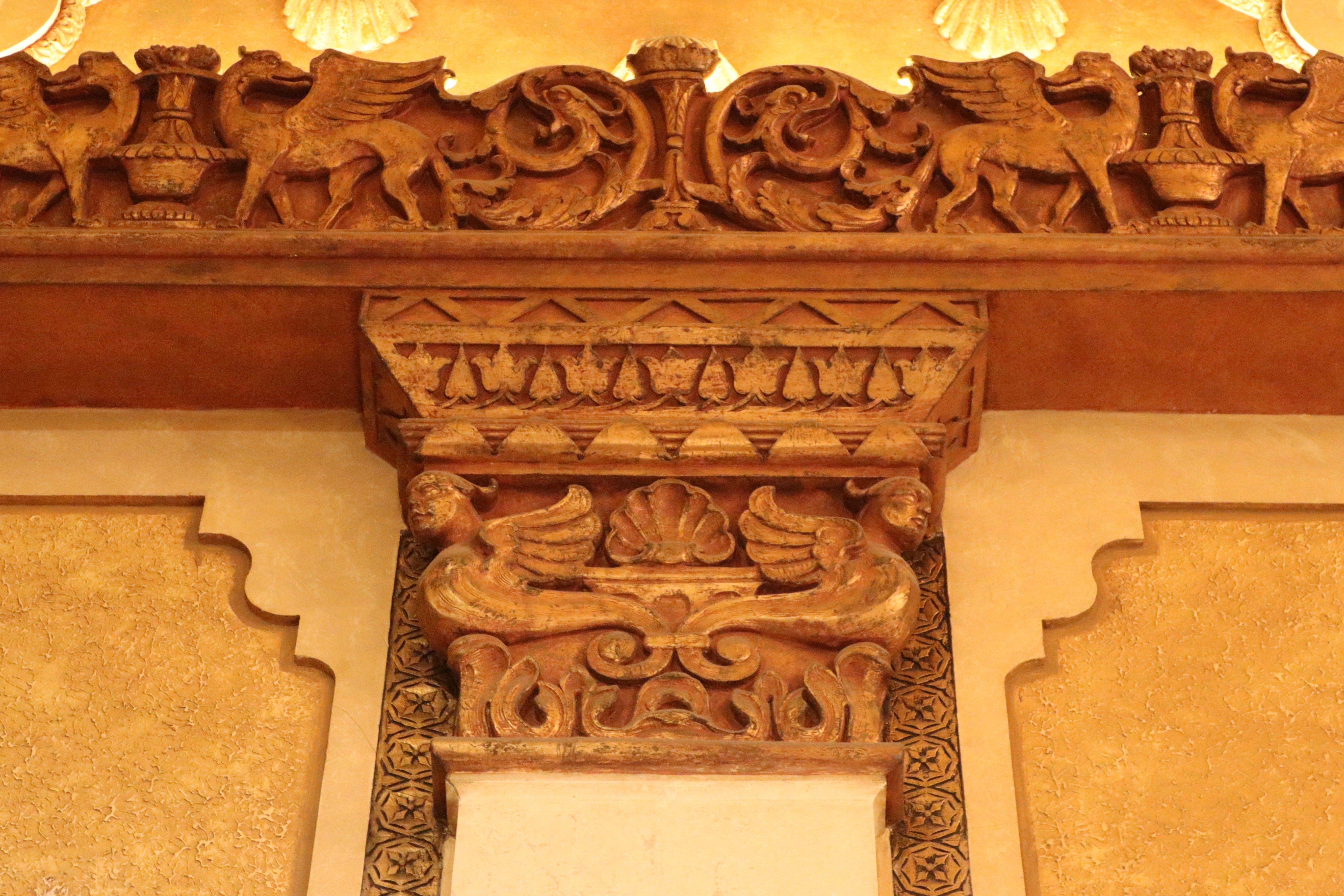 The lobby of the theatre has two large two-story spaces, with a one-story space in between. The first space you walk into is the “Hall of Mirrors.” Beyond that is a larger space in a Spanish Revival style.