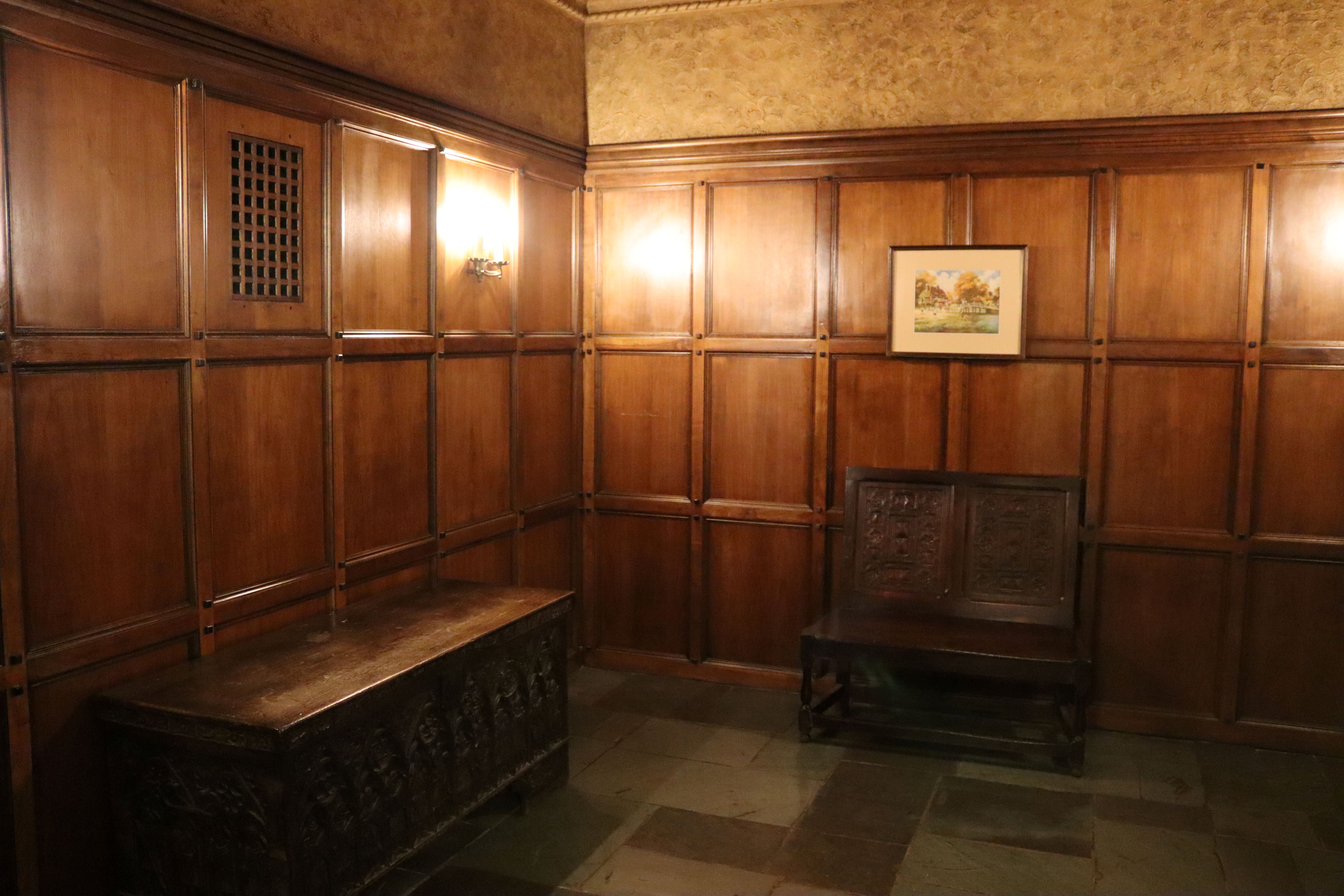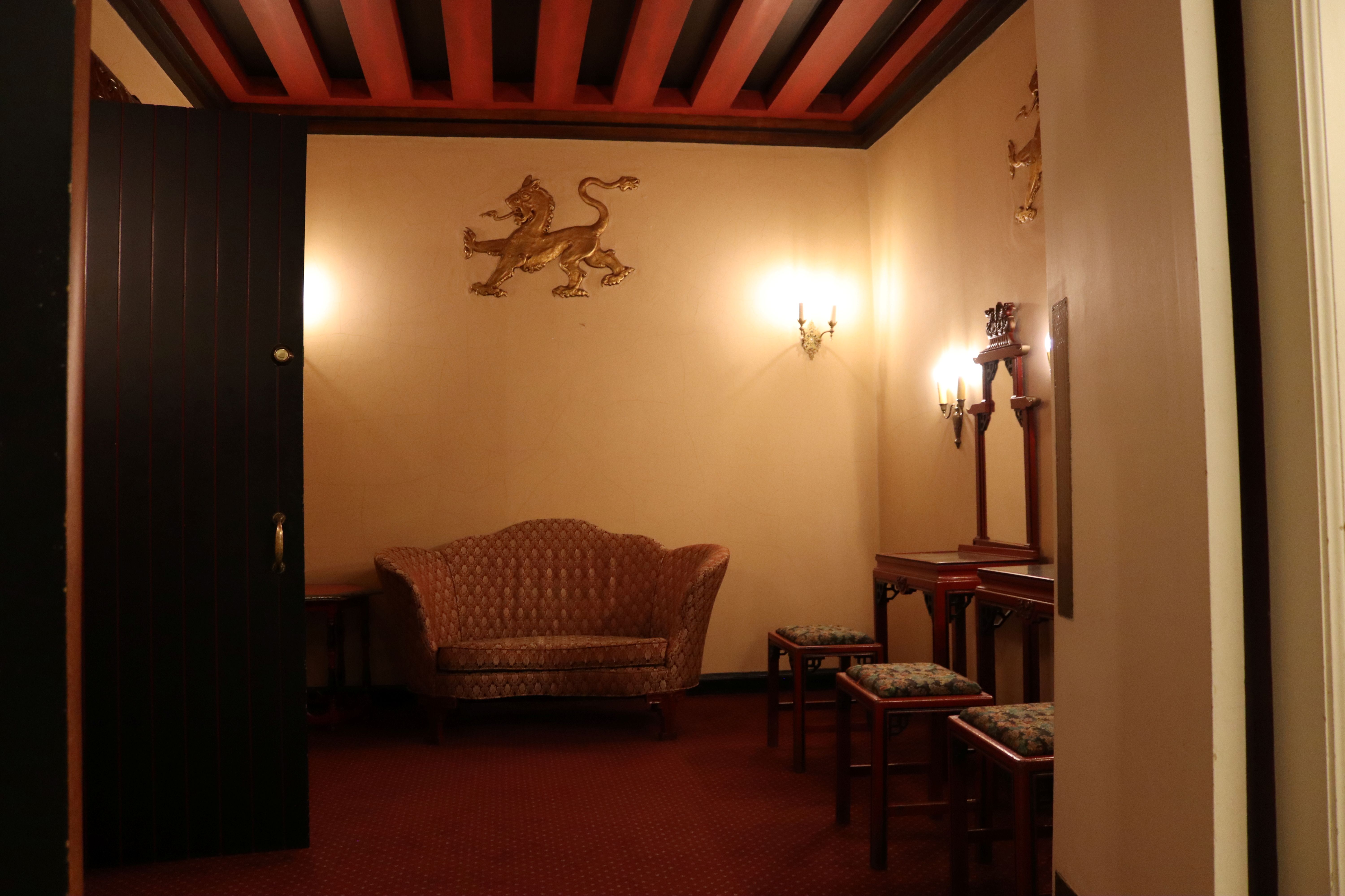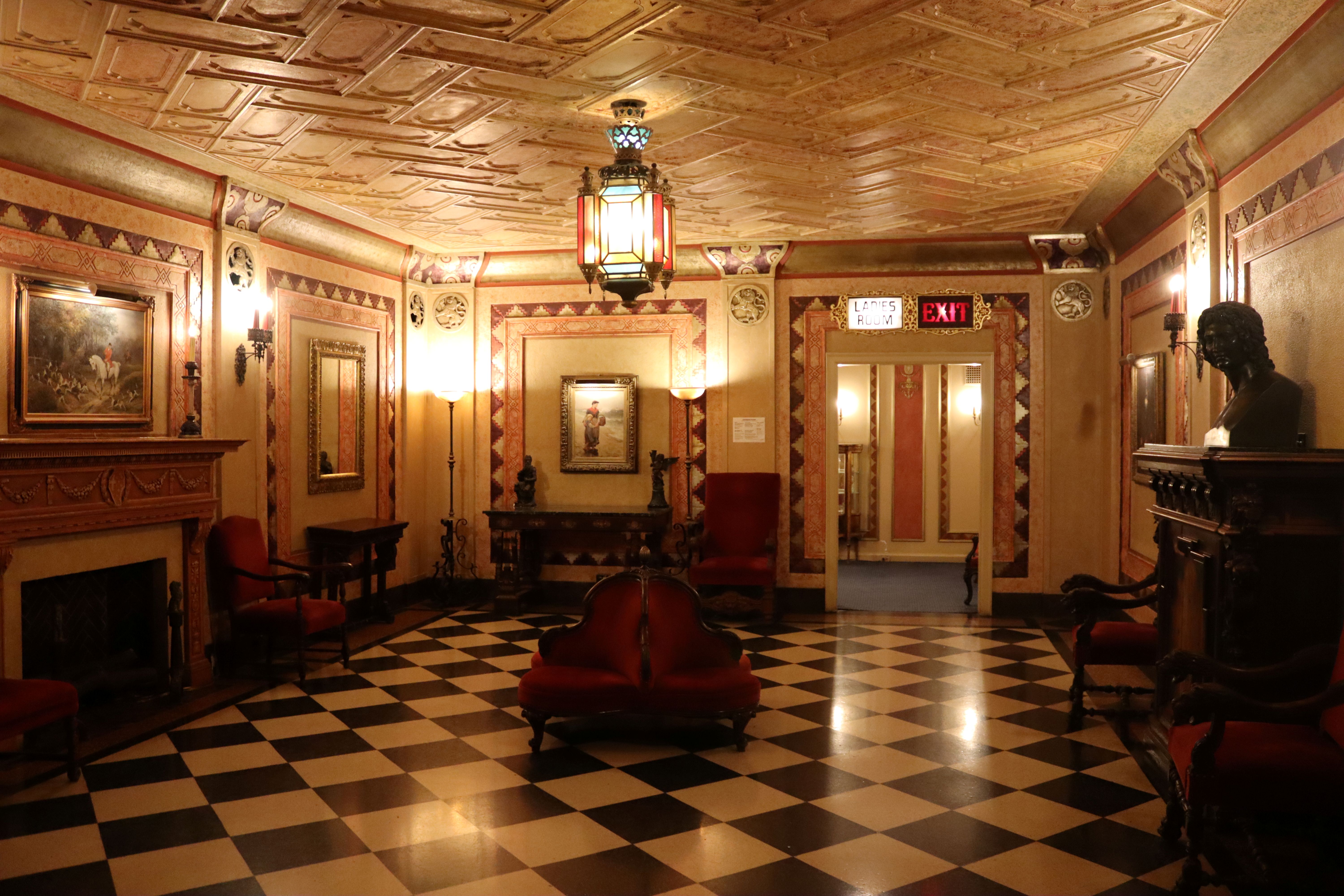 On the top level of the theatre are two more bathrooms. Like downstairs, the Men’s Room looks like an English hunting lodge. The Ladies’ Room, however, is in a Chinese style.