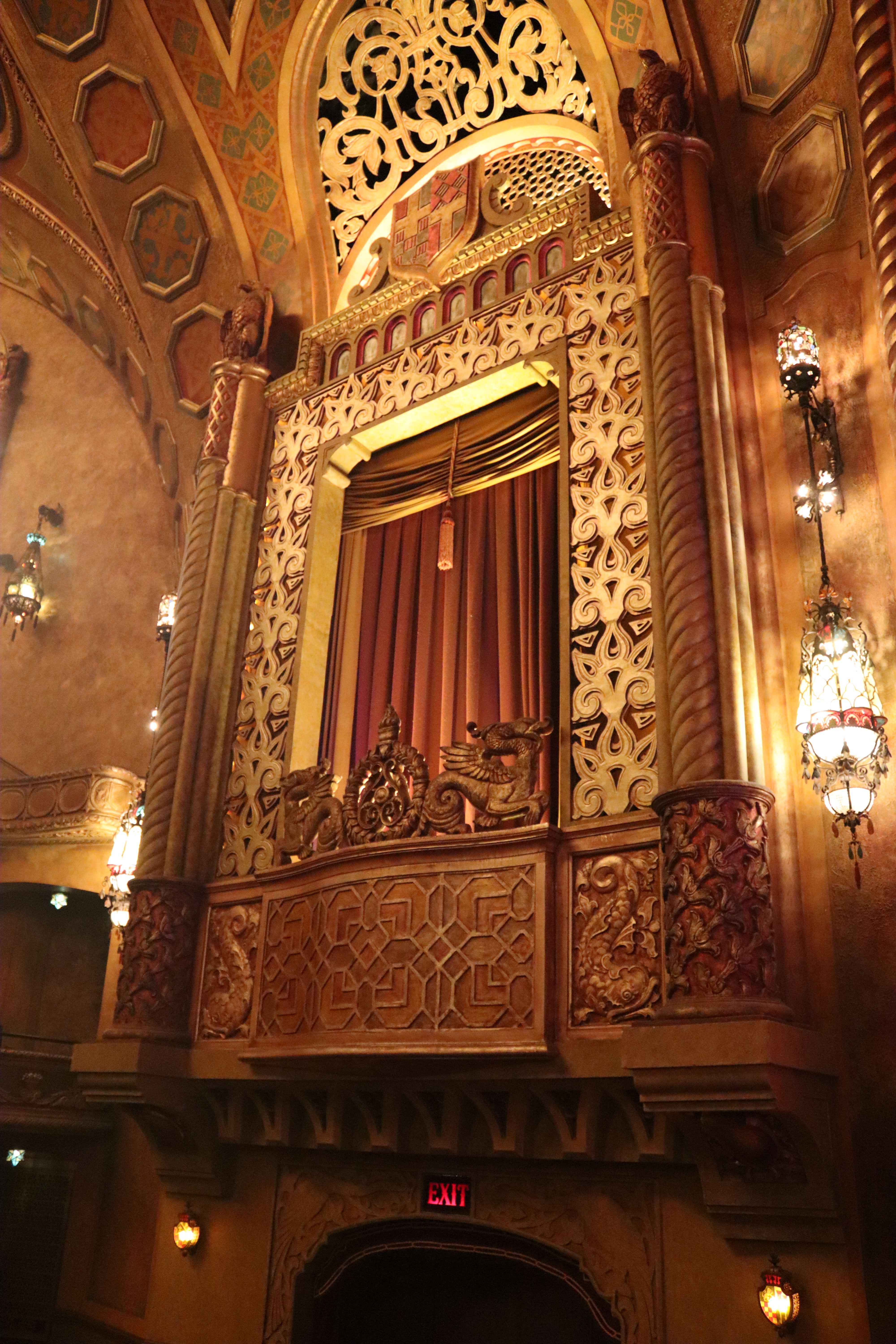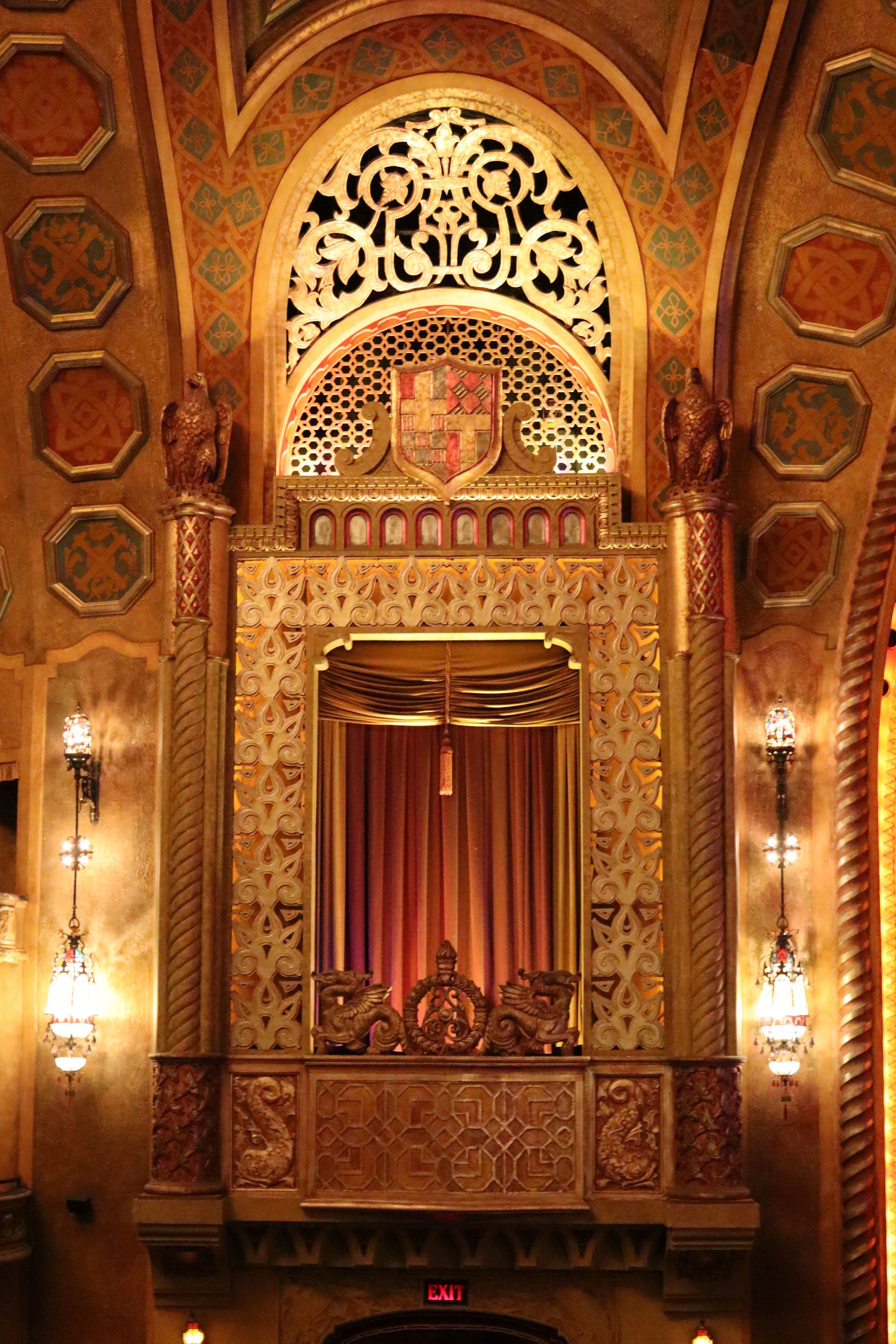 The chambers for the organ are hidden on each side of the proscenium in what looks like box seats. For some reason, only my photos of the left side turned out well.